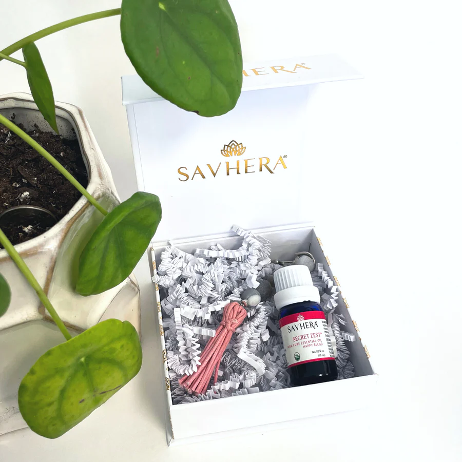 Delight a loved one with this uplifting gift set that celebrates the freedom of its craftswomen:  an on-the-go diffusing keychain and “Secret Zest”, our organic blend that promotes happiness and well-being.